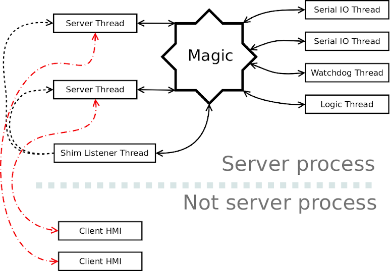 The client HMI processes is the “client” processes that interface with the “server”. The client HMI process may be a touch screen interface, a data logger, some sort of gateway to a web/mobile application, etc. Initially the client HMI connects to the Shim Listener Thread which in turn spawns a new thread – Server Thread – and from that point on the client HMI communicates with that Server Thread.